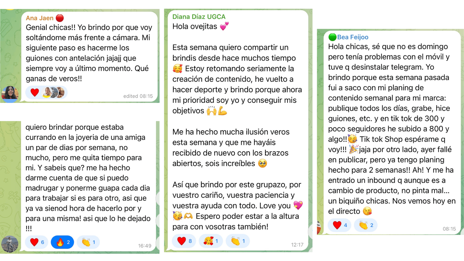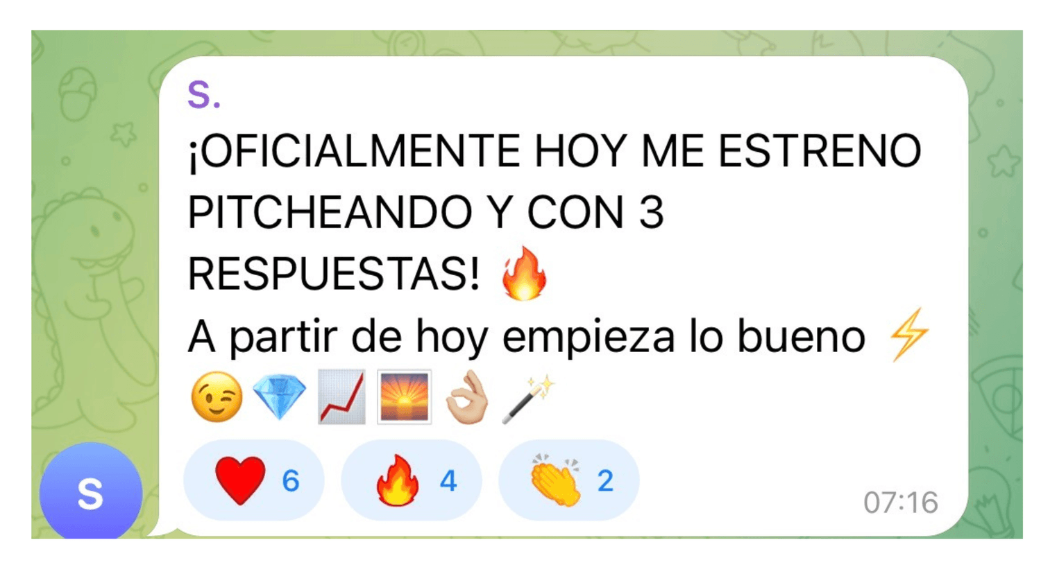 Puedes resolver tus dudas y pedir feedback en las sesiones en directo y para que no tengas que esperar, también podrás hacerlo 24/7 por nuestro grupo de soporte y comunidad por Telegram. Ahí estaremos tanto el equipo como el resto de alumnos, siempre dispuestos a ayudarte en lo que puedas necesitar.